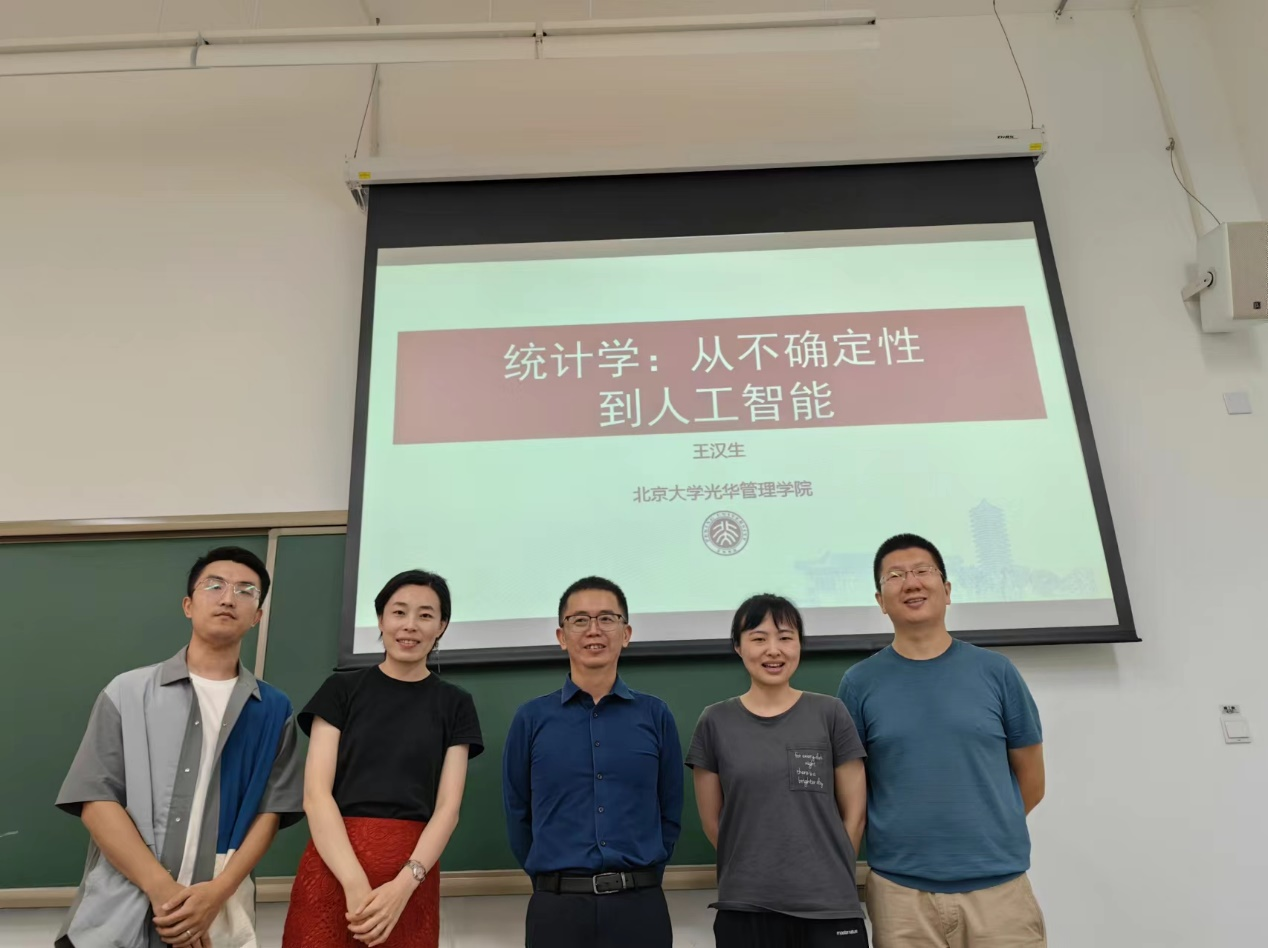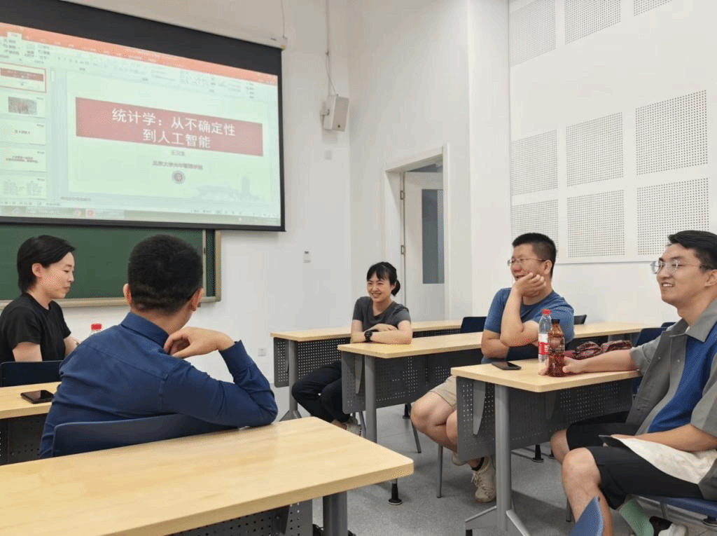 王汉生教授与青年创新团队就统计学的不确定性到人工智能主题展开了热烈讨论,王汉生教授着重讨论了关于智能售货机的开发及应用过程中模型分析与最优决策的重要参与作用。团队成员马凌飞介绍了来自加拿大滑铁卢大学的统计学实用经验,团队成员李丰副教授讨论了电商场景下的复杂时间序列预测问题与重要实证经验。团队与校外专家就本项目的理论框架、模型分析、决策研究等等问题进行了深入探讨。