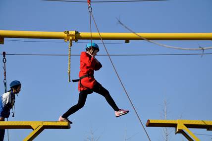 整个拓展过程充满了智慧和挑战,对团队的适应能力、抗压能力、协作能力、决策能力、执行能力等都进行了考验与锻炼,但所有队员都能够勇于承担、突破自我、相互鼓励、团结协作,最终克服困难并圆满完成了各项任务。上午的活动均为中空拓展。第一个项目为侧爬网,每一位队员要从距地面5米的绳网的一端爬到另一端,总长20米左右;第二个项目为空中抓杠,项目要求每一位学员独自爬上一个5米高的高台,然后奋力越出,去抓住横在空中的单杠;第三个项目为空中断桥,每一位队员要从立柱爬上距地面5米,宽1.2米的断桥,并从桥的一端跳到另一端。这些拓展项目增强了队员们在面对挑战时应具备的生存能力和适应能力,队友之间的相互鼓励和嘹亮的加油助威使队员们克服恐惧,接受挑战。从而达到提升综合素质和无限潜能、实现自我突破和自我超越的目的。