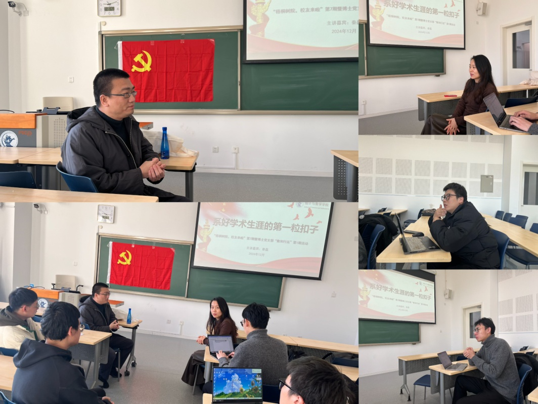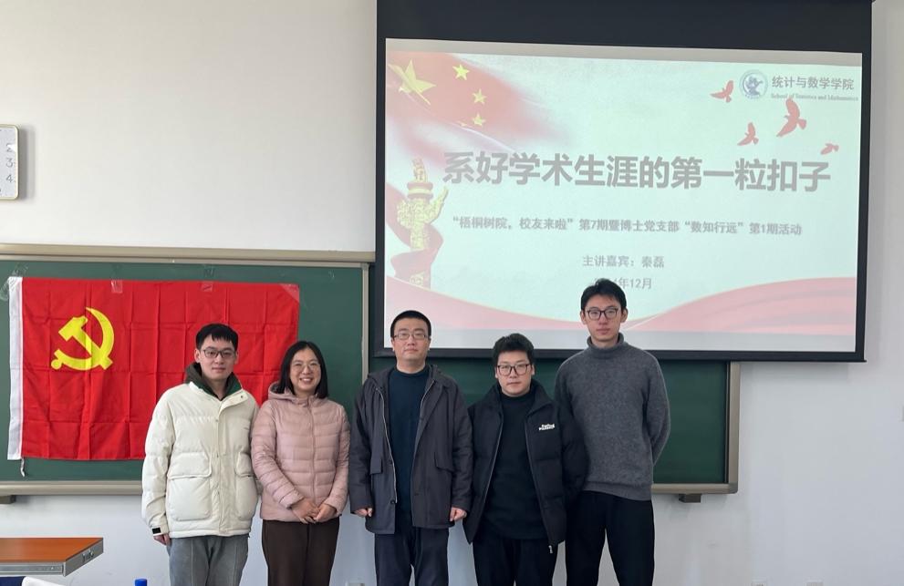 2023年12月13日,太阳成集团tyc234cc成功举办《梧桐树院,员工来啦》第七期暨博士生党支部“数知行远”第一期活动。本次活动特邀公司2011级统计学博士、现任对外经济贸易大学统计公司教授、博士生导师秦磊为嘉宾,与同学们分享科研与求职的经验与感悟。