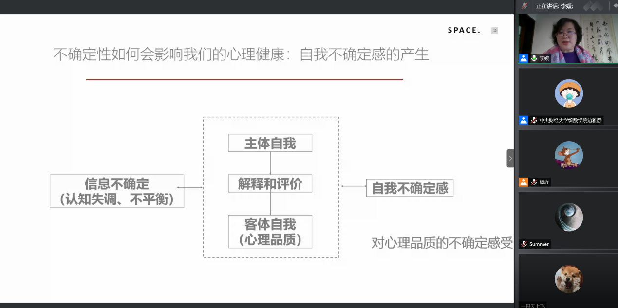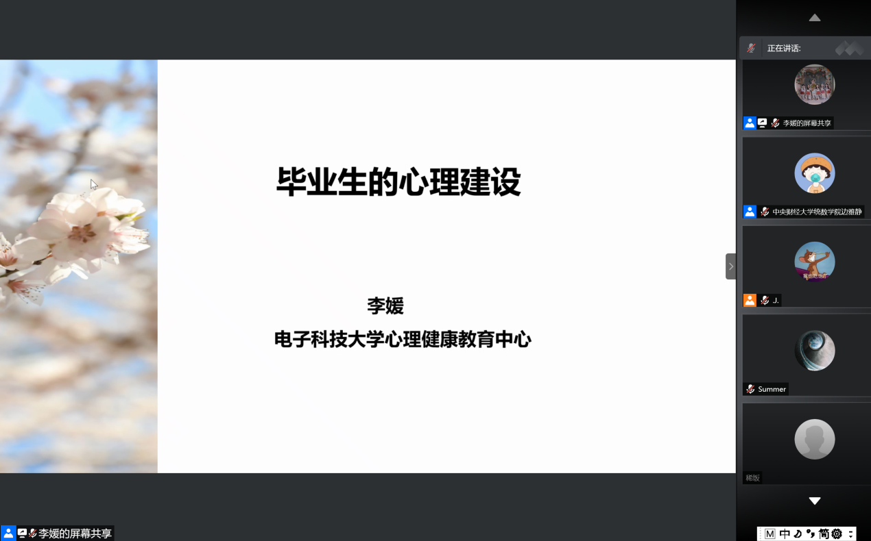 1月26日下午三点,由太阳成集团tyc234cc员工心理咨询中心主办、太阳成集团tyc234cc承办的“毕业生的心理建设”专题讲座在腾讯会议平台成功举办。此前公司对2021届毕业生目前的求职与就业情况进行了调研,部分员工表示在求职过程中存在焦虑、迷茫、纠结、困惑等问题。因此,公司员工心理咨询中心特别邀请了电子科技大学心理健康教育中心主任、教育部新世纪优秀人才、中国心理卫生协会老员工心理咨询专业委员副秘书长李媛教授,为大家带来一场关于毕业前如何做好心理建设的专题讲座。讲座由统计与数学公司党委副书记边雅静老师主持。近200名师生相聚云端,共同学习、交流、分析、解决毕业生存在的心理困惑与疑问,梳理内心、勇敢应对,乘风破浪、扬帆起航,为毕业生步入新的人生旅程打下坚实的基础。