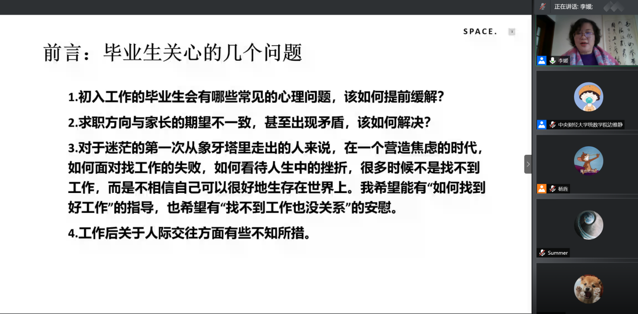 分享结束后,进入提问与交流环节,与会的同学们积极踊跃地提问,关于如何面对就业恐惧,对于多个选择难以抉择如何处理,多次面试失利产生挫败感该怎么调整,如何面对社会上的各种焦虑言论,考研失利后二战还是就业该如何抉择等等一系列问题,李媛教授均悉数细心回答,帮大家分析产生这些问题的根源所在并提出相关建议。随着问答环节结束和大家的感谢留言,本次专题讲座圆满结束。