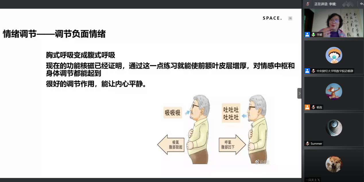 首先,李媛教授从几个共性问题入手,比如“求职方向与家长的期望不一致,甚至出现矛盾,该如何解决?”,“工作后在人际交往方面有些不知所措”等等,开启了分享,她围绕疫情下毕业生的挑战、毕业生心态调整的策略、给毕业生的几点建议三个方面进行了深入讲解。李媛教授认为:在疫情下,生活充满了变化,大到经济波动、政治变革、气候变化,小到个人工作变动、收入增减、人际关系改变,都会使人们产生不确定感,不确定感包括信息不确定感和自我不确定感,而不确定感会导致人们进行自我否定,因此需要大家重点关注并且及时做出调整。在毕业生心态调整策略方面,李媛教授指出,分离是人们一生的主题。分离源于生存本能,是发展的需要,也是关系的需要。高中毕业、大学毕业、研究生毕业,同学们都将面临分离,而这种分离恰恰也是成长的体现。在此环节中,李媛教授还基于压力源、影响因素、压力反应三个方面向同学们提供了烦躁、迷茫、抑郁、焦虑等心态的调整策略。同时,李媛教授还提出了三点建议,分别是“明晰价值,找到方向“,”接触当下,关注此刻“,”确定目标,承诺行动“,并且提醒同学们要用心体会,切实落实。