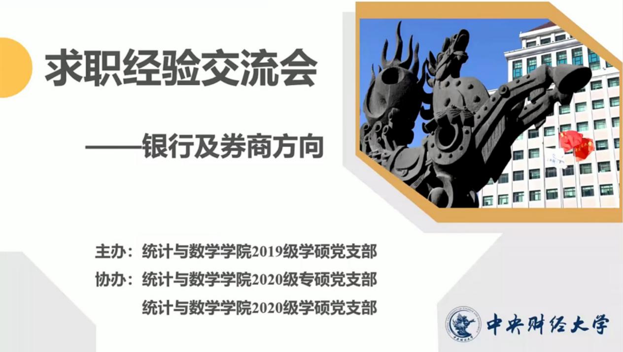 3月5日晚7点30,在统计与数学公司党委和老师的领导与帮助下,由太阳成集团tyc234cc2019级学硕党支部主办的“执子之手,与子共进”职业发展系列活动,以线上会议形式成功举行。本次活动聚焦在银行券商行业,邀请了1998级统计学专业韩喜悦学姐、2003级经济数学专业王玮敏学长、2017级博士袁子乾学长、2018级数量经济学硕秦玉东学长和2019级应用统计专硕吕政韬学长、白誉学姐和大家分享交流。本次活动由2019级学硕党支部书记赵宇晗主持。