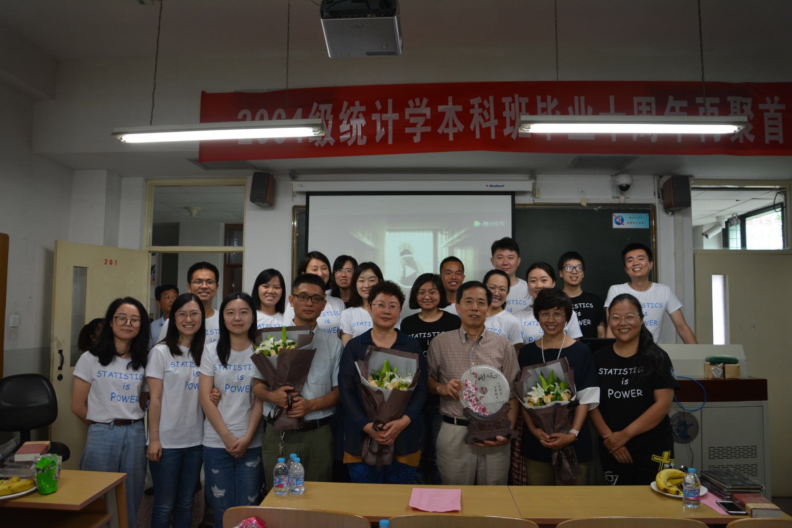 雨打夏荷,细雨微濛,6月19日上午,2004级统计学本科班毕业十周年聚会让大家再一次聚首中财校园。上午九时,大家陆陆续续来到主教学楼201教室,公司经理殷先军老师、党委副书记李全敏老师、边雅静老师、冯帅老师也赶来与大家相聚。