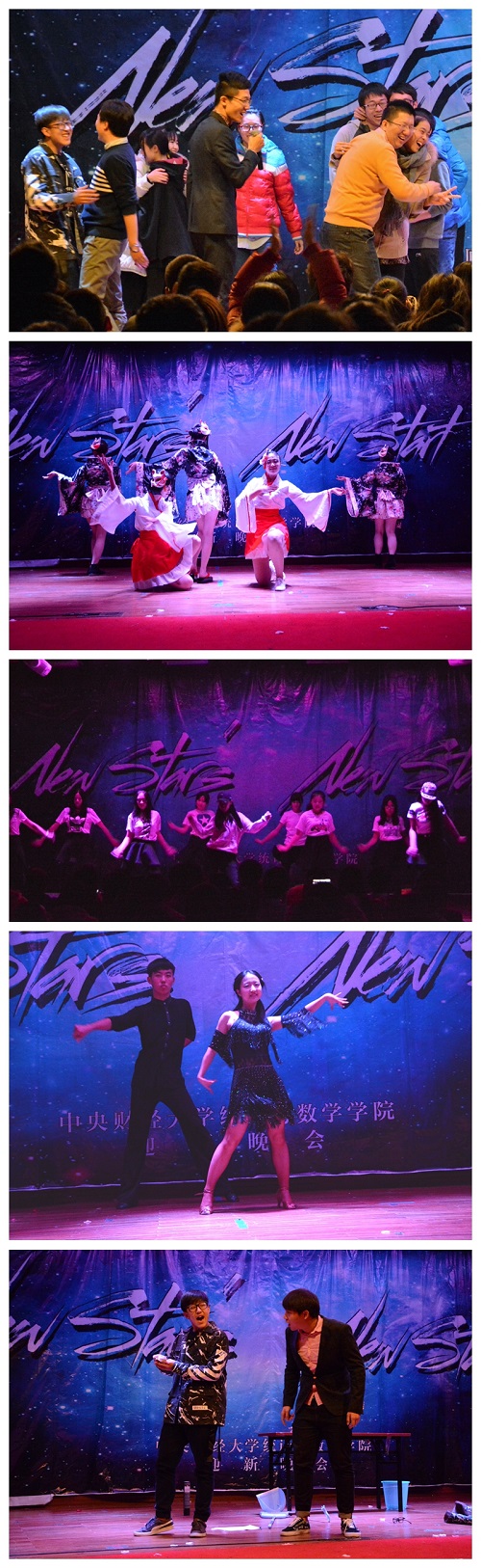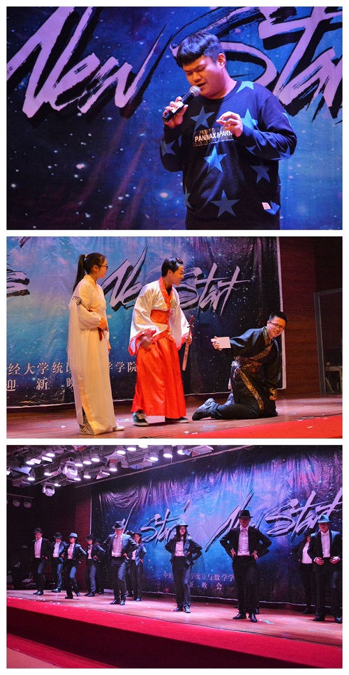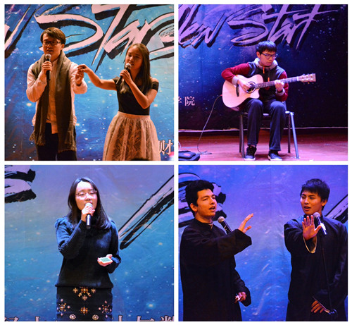 以“NEW STARS’ NEW START”为主题的迎新晚会伴着充满活力的开场舞正式开始。在对唱串烧中,或悠扬或深情的音乐烘托出恬静安然又充满温情的氛围,观众们对歌手的喜爱也盈满整个互动屏幕;相声《Say NO》引得场下同学笑声不断,穿梭于世界各国的“废柴王子”形象深入人心。紧接着舞台灯光变暗,一曲清新的吉他指弹《柠檬树》让观众们纷纷安静下来侧耳细听,颇有“大珠小珠落玉盘”的韵味;而“搞点事情”乐队一转之前的节目风格,场下观众们随着节奏十足的音乐挥舞着闪光灯,晚会气氛逐渐被推向高潮。