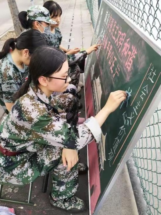 五营负责板报的同学在烈日之下用粉笔将英勇的军人和雄伟的华表展现在黑板之上;凝结在作品当中的,是同学对军人倾注的敬意,是少年向祖国倾吐的真心。在操场上挥洒汗水,是青春对祖国的告白;在幕后表达一片赤诚,同样是青春对祖国的告白。