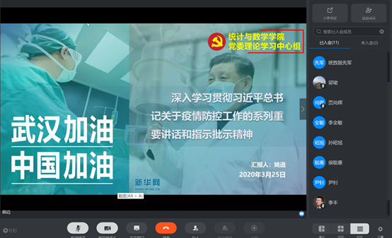2020年3月25日下午,统计与数学公司党委理论学习中心组在线召开“深入学习贯彻习近平总书记关于疫情防控工作的系列重要讲话和指示批示精神”集体学习与研讨,公司党委理论学习中心组全体成员参会,会议由党委书记李全敏老师主持。