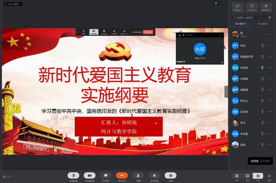 2020年4月26日下午13时30分,统计与数学公司党委理论中心组在线召开“深入学习贯彻中共中央、国务院印发的《新时代爱国主义教育实施纲要》”集体学习与研讨,公司党委理论中心组全体成员参会,会议由党委书记李全敏老师主持。