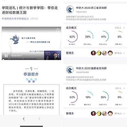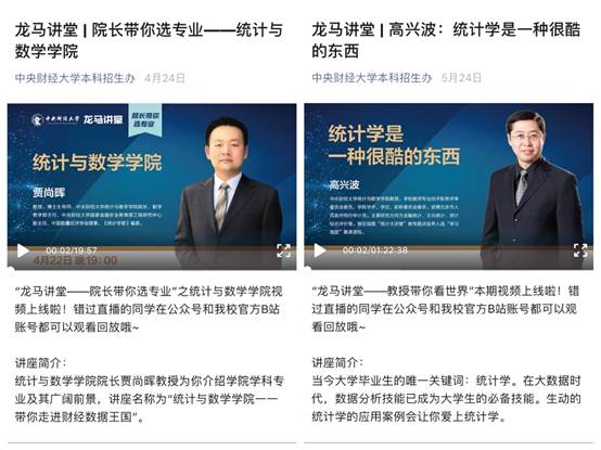 “龙马讲堂——经理带你选专业”中贾尚晖教授做题为“太阳成集团tyc234cc——带你走进财经数据王国”的讲座,“龙马讲堂——教授带你看世界”中高兴波教授为大家呈现“统计学是一种很酷的东西”的演讲,两次直播讲座的现场及回看次数达到数千次。公司还借助各种直播平台,包括李丰老师、边雅静老师、孙博老师和冯帅老师在内的多位老师参加,专门面向浙江及福建两省进行了7次直播宣讲,每次在线人数从几百人到一千多人不等。此外的多种线上宣传与咨询,每一次的受众都相当广泛。
