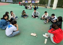 集体游戏——丢手绢!同学们小圈变大圈,围坐在地上,唱起了儿时的歌曲,“丢手绢丢手绢,轻轻地放在小朋友的后边……”,被推选为丢手绢的人沿圆圈外行走,不知不觉将手绢丢在其中一人身后,奔跑——追逐,大家玩得不亦乐乎,一片欢声笑语。被抓住的同学要表演一个节目,若未抓住,新玩家需要做个自我介绍,并开始下一轮的游戏。在游戏的过程中,大家的位置也在不断的变化着,伴随着同学的表演,现场其乐融融。在游戏结尾,同学们齐唱《追梦赤子心》。