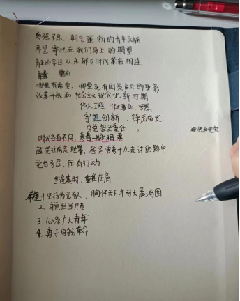习近平总书记说:“中华民族是历史悠久、饱经沧桑的古老民族,更是自强不息、朝气蓬勃的青春民族。在五千多年源远流长的文明历史中,中华民族始终有着自古英雄出少年的传统,始终有着长江后浪推前浪的情怀,始终有着少年强则国强,少年进步则国进步的信念,始终有着希望寄托在你们身上的期待。青春的力量、青春的涌动、青春的创造,始终是推动中华民族勇溢前言行屹立于世界民族之林的捍卫力量。”令我深感责任之重大,青春须早为,岂能长少年,处于宝贵时期的我们生逢其时,也责任在肩。我们热爱自己的国家,热爱与一切腐朽势力作斗争的党,我们自当将自己投身于时代洪流之中,为祖国崛起贡献自己的力量。