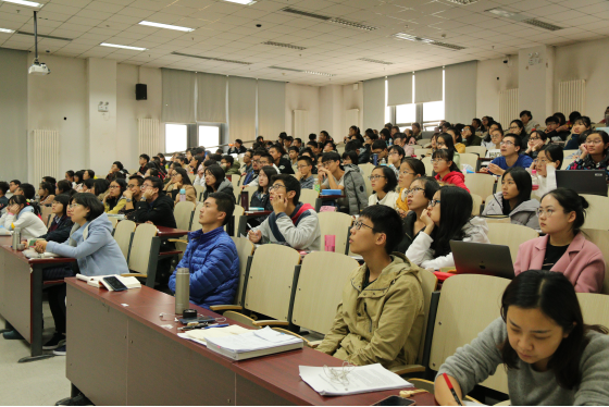 通过讲授数学起源与历史,孙老师自然而然的引出了大学数学的若干基本问题,尤其是高等数学与初等数学在知识理论体系方面的区别与联系。从中学到大学,从静止到运动,从具体到抽象,从有限到无穷。例如微积分中让很多同学头痛至极、难以理解的“极限”的定义,大学数学中数学概念的高度抽象是大一新生初学高等数学的最大困难之一。孙老师用简明形象的语言,向同学们生动的阐述并解读了高等数学是如何实现了从有限到无穷,而又用有限来刻画无穷的过程,让同学们感受到精准的数学语言如何完美的解答了曾困扰人类两千多年的各种悖论,为大家打开了一扇新的通向数学的大门,让同学们恍然大悟。