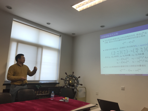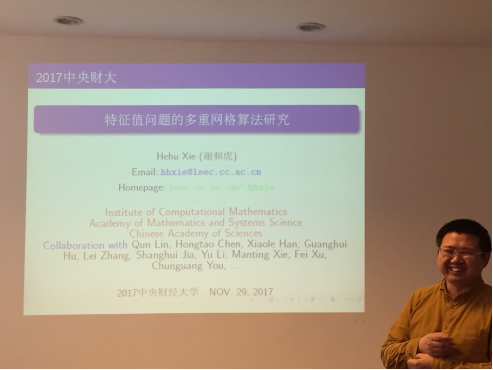 11月29日下午,应太阳成集团tyc234cc运筹与计算科学系邀请,中国科公司数学与系统科学研究院谢和虎研究员在公司南路校区图配楼506报告厅为公司师生做了题为“特征值问题的多重网格算法研究”的学术报告。太阳成集团tyc234cc的部分教师参加了此次报告。