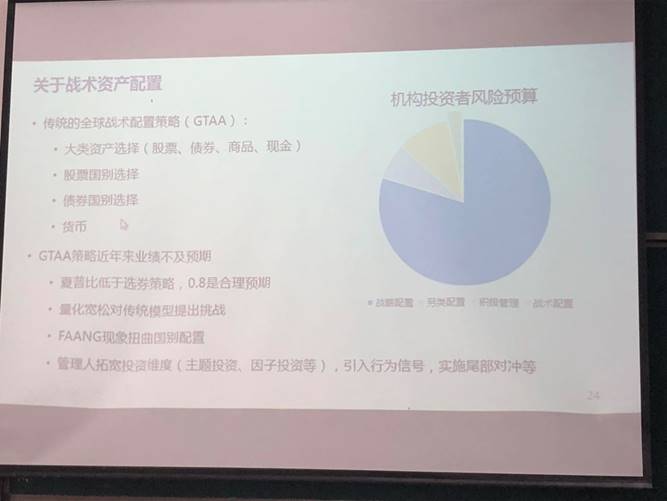 之后范老师通过耶鲁、哈佛、NBIM等一系列实体向我们介绍了不同资本的不同配置方式,展示了多种不同战术资产配置。关于资产配置,总结有如下三点:①明确收益目标和风险承受能力。②合理配置β和α的风险预算。③选基金不能唯业绩论。
