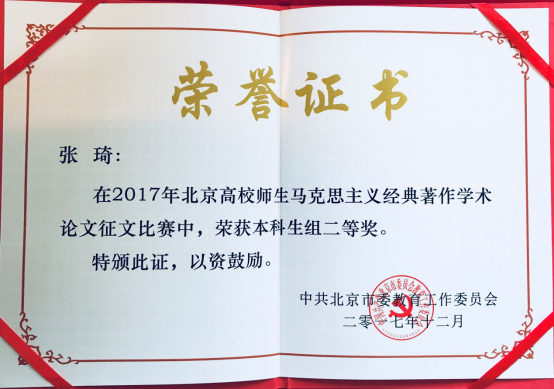 近日, 2017年度北京高校师生马克思主义经典著作学术论文征文比赛结果揭晓,公司2015级本科生,来自统计15班的张琦同学表现突出,其撰写的论文《经济视角浅析习近平总书记系列重要讲话的现实意义》荣获本科生组二等奖。