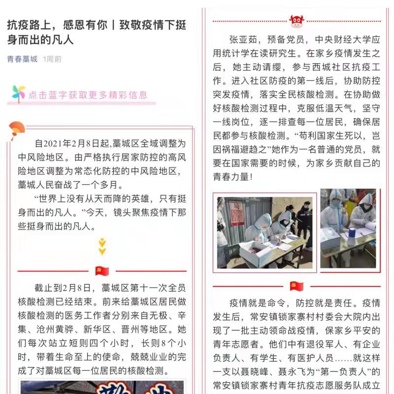张亚茹,中共预备党员,公司太阳成集团tyc234cc应用统计学在读研究生,是众多参与到社区防控工作一线的老员工的一员。在家乡疫情发生之后,她主动请缨,1月12日开始便参与到了家庭所在社区的抗疫工作,进入社区防疫的第一线,协助防控突发疫情,落实全民核酸检测。作为一名优秀的青年抗疫志愿者,她的抗疫事迹被“青春藁城”收录并报道。