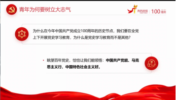 团课中,郭老师从习近平总书记“七一”重要讲话出发,着重把握中国青年对党和人民事业的重要作用,向各位团员发出号召,做新时代的中国青年,需增强志气、底气、骨气。