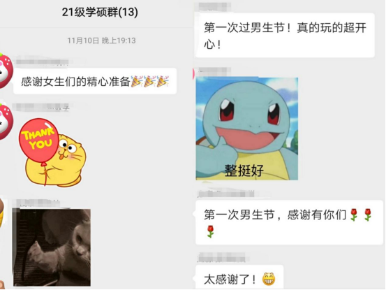对于这次男生节团建活动,学硕21支部的男同学们也纷纷表示了惊喜和感动,有同学说这是来自理工科公司的他第一次过男生节,将是非常难忘的经历,也有同学说非常感谢这次男生节的精心准备,以后大家还要常常一起团建、共同分享研究生生活的点滴乐趣。