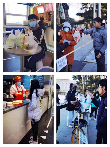后援团根据学弟学妹的问卷中的就餐需求,提前购买好菜品,并送往指定地点,送餐同时,也不忘为学弟学妹们加油打气、送上祝福。