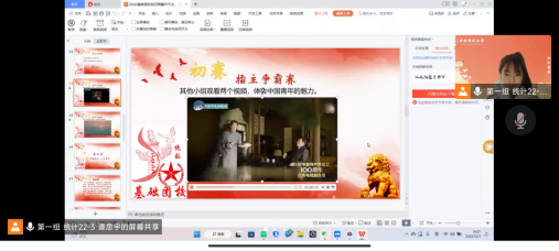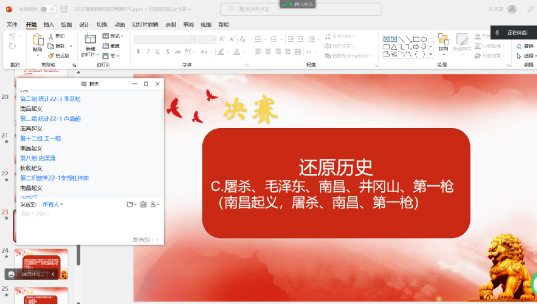 初展锋芒。主持人发出共15个关键词,每个小组需要从每五个中选取三个组成一句话或一段话,并叙述出来。在还原历史的第三题中主持人给出了“毛泽东,井冈山,南昌第一枪,屠杀“五个关键词,各组学员纷纷在聊天区打出自己的答案。连词成句不仅考验学员们对历史事件的了解程度,更挑战大家的反应速度,抢答场面热火朝天。进行两轮激烈的抢答后,第二组同学披荆斩棘,拔得头筹,成为了本次知识竞赛趣味竞赛环节的优胜者。