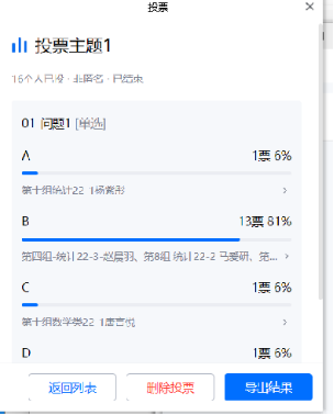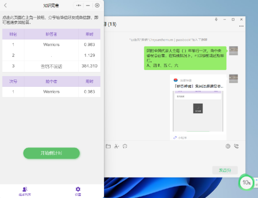 擂台争霸环节,十三个小组分别在四个会议室决出擂主。为了满足线上答题的需要,四名主持人在各自负责的会议室中发布群投票,让各位同学以投票的形式选出答案。并根据答题情况数据统计分数,决出擂主。得分最高的小组即为擂主组,擂主组与其他组各派三名代表进入微信群通过小程序进行抢答,并由主持人将抢答过程实时共享给会议室中的非代表同学。热烈的抢答气氛点燃全场。