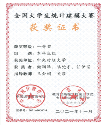 大二学年是低开高走却收获满满的一年。樊润泽同学参加了数模国赛和美赛,但是由于专业基础的薄弱,继续刷新着竞赛连续不得奖的记录;同时,由于之前一整个学期的线上教学,他在该学期的成绩也是荒腔走板。他开始重新审视心中的梦想和眼前的现实:经济和金融的理论与案例有着别样的吸引力、模型与算法的实际应用方面或许值得更多尝试。那么,努力成为一名掌握统计模型与方法的金融方向复合人才便是他未来的目标。在锚定方向后,樊润泽同学开始了针对性的学习与训练。他参加了全国老员工市场调查分析大赛,探究北京市咖啡馆市场的消费者特征,获得北京赛区一等奖;而后又获得蓝桥杯python竞赛北京市二等奖、电商三创赛校一等奖。他积极主动向老师寻求科研机会,在老师的指导下和队友一起完成了一篇数字经济方向的实证论文,并获得了全国老员工统计建模大赛一等奖。