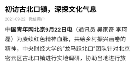 2021年叶濯缨同学参加了助力乡村振兴与传统文化宣传的暑期社会实践活动,作为团队负责人对接古北口政府,结合当地的红色基因,通过实地调研用当代青年的视角把红色精神融入到文创作品中,为当地的旅游事业获得新的竞争力的同时,也弘扬了红色精神。这获得了当地政府的好评,同时获中青网两次报道。