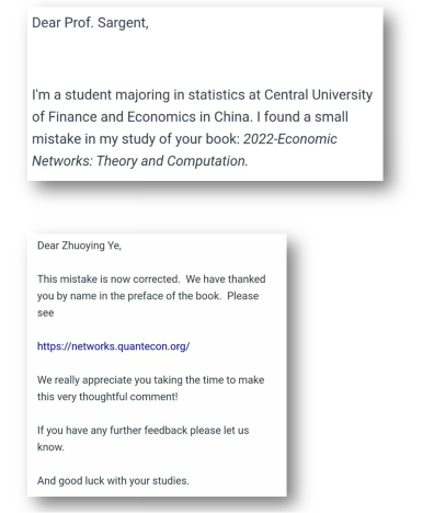 兴趣带领着叶濯缨同学走入学业的大门,而肯钻研的科研精神,则帮助他在专业的道路上走的更深更远,也为他带来了更广阔的视野。大一寒假时他作为科研助理加入了国社科重大项目,参与《农业贸易成本与非关税措施》一书的编写工作。开始他只是从事资料翻译整理工作,之后由于数学专长,承担起部分章节的数学推导、模型建立及报告执笔等工作。海量从未接触过的名词、知识点增加了任务的难度,除了向老师请教,还需要向百度、知网、谷歌学术等网站寻求答案,甚至需要阅读大量的书籍、论文。2021年,他通过选拔进入中国财政发展协同中心的实验班,学习了博弈论、计量经济学等多学科理论;同时作为科研助理参与了多项国社科、财政部课题,并多次担任课题组协调人,参与撰写报告。在学习诺贝尔经济学奖得主萨金特《Economic Networks: Theory and Computation》一书时,发现书籍中数学算法错误,得到了他的回信并将自己的名字加入了该书的前言致谢名单当中。