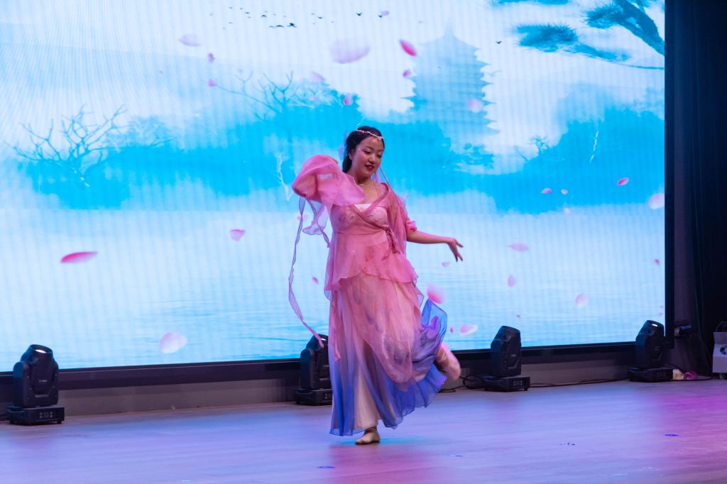 陈芷琪带来舞蹈《流水桃花》,古典舞传承着中华文化的精粹,婀娜多姿、美丽动人的舞蹈,也表达了舞者在临近毕业时对大学时光的回望,正如春日桃花灼灼绽放,不负美好年华。