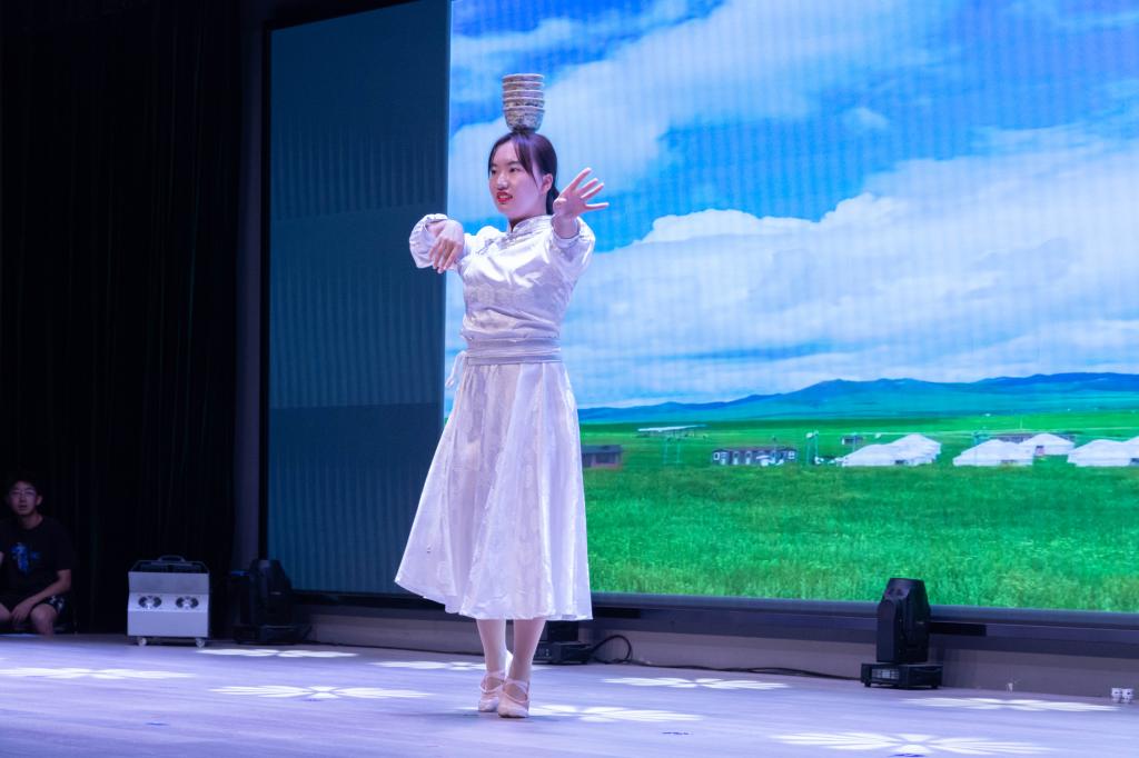 闫晓菲带来顶碗舞《白马》,这支来自蒙古族的舞蹈,让我们在中财校园里领略大草原的热情和自由。