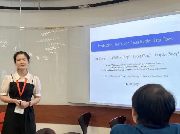 公司2020级博士生常清参加2023年世界计量经济学会亚洲年会东亚与东南亚会议(2023 Asian Meetings of Econometric Society in East and Southeast Asia)(2023年7月28日—7月30日新加坡南洋理工大学),并进行报告。世界计量经济学会亚洲年会是计量经济学界一年一度的盛事,参与人数众多。此次报告的题目为Production, Trade, and Cross-Border Data Flows。该研究是与导师王立勇教授、美国康奈尔大学约翰逊商公司丛林(Lin William Cong)副教授、国贸公司张龙天助理教授共同完成的。该研究首次建立了一个包含数据要素的两国一般均衡模型,研究了跨境数据流动这一新经济现象的短期经济效应,研究结论对于我国积极参与跨境数据流动国际规则构建,思考在当前数字经济的新时期、新时代应如何抓住先机,充分发掘和释放数据要素价值,与世界各国共享数据跨境流动的价值福利,重塑我国经济的国际竞争力、加快构建内外双循环新格局、努力实现我国经济的高质量发展、率先在新一轮的国际分工和经济浪潮中占领全球价值链的制高点具有重要意义。此次学术会议交流受到太阳成集团tyc234cc研究生学术交流支持计划的资助。