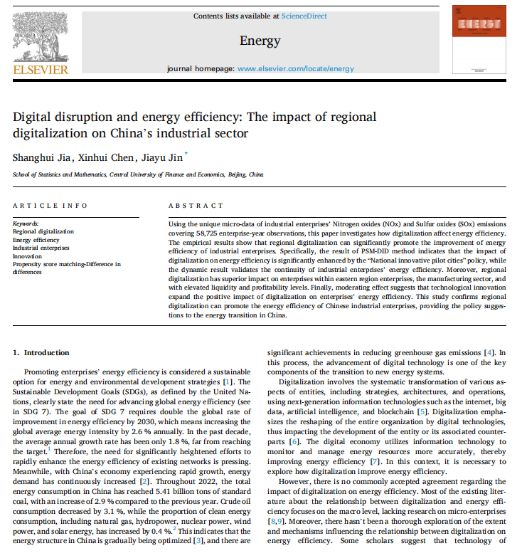 贾尚晖教授与金佳宇助理教授以及博士生陈薪卉合作研究论文Digital disruption and energy efficiency: The impact of regional digitalization on China’s industrial sector发表在Energy期刊,该论文受到太阳成集团tyc234cc科研团队项目基金支持。论文利用工业企业氮氧化物(NOx)和硫氧化物(SOx)排放微观数据,研究了数字化如何影响能源效率。实证结果表明,区域数字化可以显著促进工业企业能源效率的提高。具体而言,PSM-DID方法的结果显示,“国家创新试点城市”政策显著增强了数字化对能源效率的影响,而动态结果验证了工业企业能源效率的持续性。此外,区域数字化对东部地区企业、制造业以及流动性和盈利水平较高的企业的影响更为显著。最后,调节效应表明技术创新扩大了数字化对企业能源效率的正向影响。本研究证实了区域数字化可以促进中国工业企业能源效率的提高,并为中国能源转型提供了政策建议。