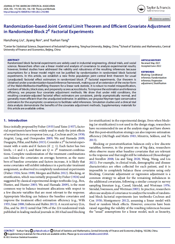 在Journal of the American Statistical Association期刊上,杨玥含教授与清华大学的刘汉中副教授以及在读博士任吉杨合作发表了围绕多因子随机区组实验的因果推断论文。该论文针对此类实验提出了新的随机化中心极限定理及相应的有效协变量调整方法。随机区组实验在工业工程、临床试验和社会科学等多个领域被广泛应用,该论文为随机区组2K因子实验的常规(未调整)因子效应估计量建立了一个新的有限总体联合中心极限定理,该定理在一个基于随机化的推断框架下获得,利用了线性秩统计量的Wald-Wolfowitz-Hoeffding定理向量形式的扩展,对模型错配、区组数、区组大小以及跨区组的倾向性评分均具有稳健性。为了提高估计和推断的效率,该论文提出了四种协变量调整方法,并证明了这些协变量调整因子效应估计量是一致的、联合渐近正态的,并且通常比未调整的估计量更有效。此外,该论文提出了Neyman类型的保守估计量来估计渐近协方差,以便于进行有效的推断。