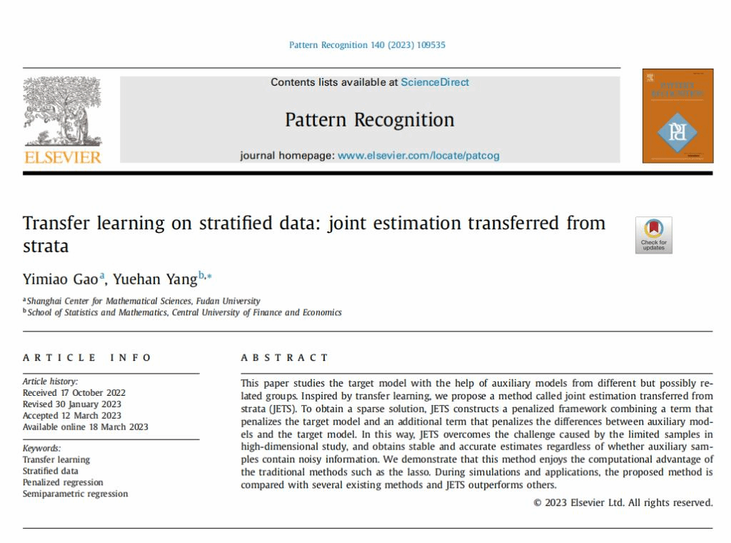 在Pattern Recognition期刊上,杨玥含副教授与员工高旖淼共同发表了一篇关于迁移学习问题的论文。该论文提出了一种名为Joint Estimation Transferred from Strata(JETS)的方法,该方法用于在高维回归模型中进行联合估计。通过在辅助模型中利用信息,同时避免噪声影响,JETS旨在获得稳定的估计结果。此外,JETS具有计算优势,可以与传统惩罚优化方法相结合,并在生存分析、线性回归等领域得到应用。实验结果显示,JETS在各种情况下都表现出良好的性能。