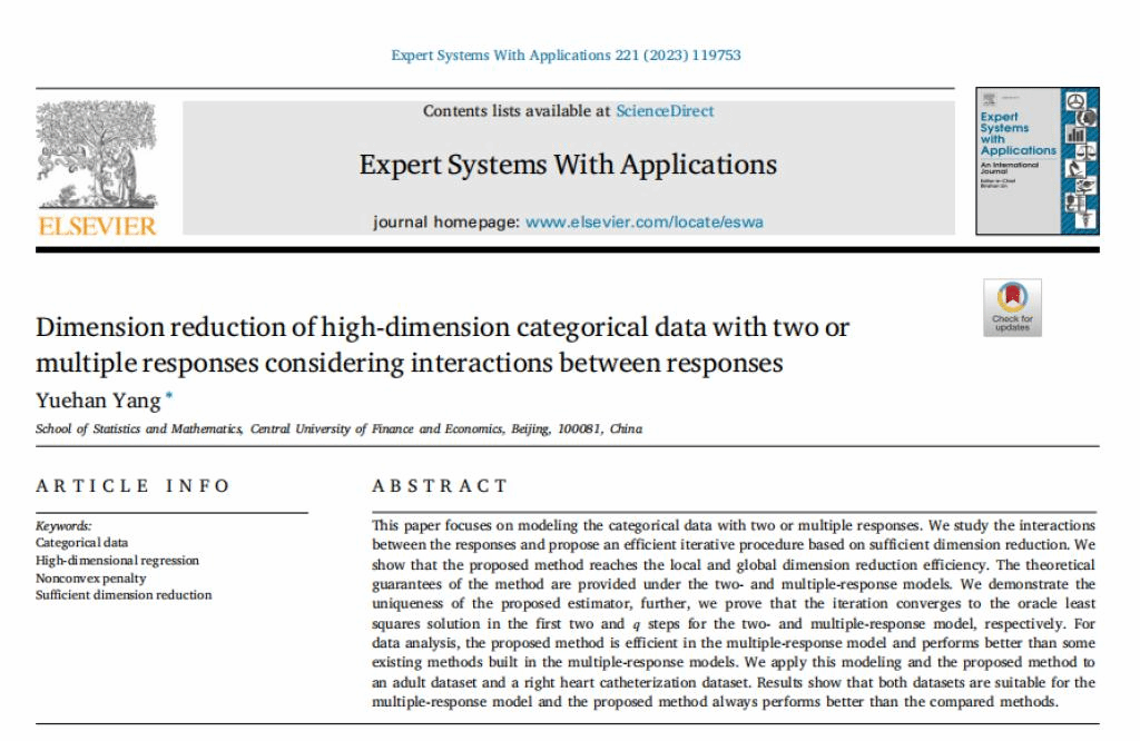 在Expert Systems With Applications期刊上,杨玥含副教授作为独立作者发表了一篇关于分类数据的论文。该论文主要研究了分类数据中具有两个或多个响应的情况,提出了一种一致性维度约简的方法。通过实施一致性维度约简技术,论文提出了一种高效的迭代算法,该算法在两个响应模型和多个响应模型中的性能优于其他方法。实验证明,该算法适用于真实数据集,可以显著降低预测误差和预测均方误差。此外,该方法还提供了理论保障,证明了所提出估计的唯一性和准确性。